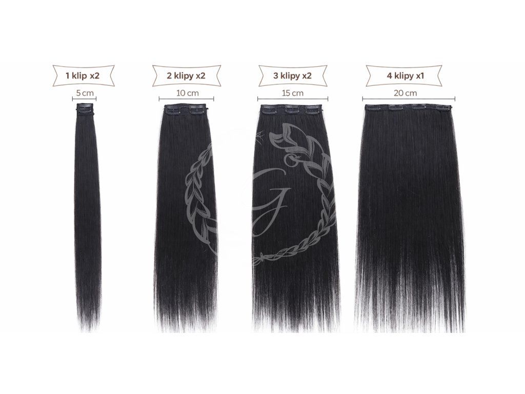 Sada obsahuje celkem 7 clip-in pásů různých velikostí, které umožňují rovnoměrné rozložení objemu po celé hlavě. Díky tomu dosáhneš přirozeného a plného vzhledu bez viditelných přechodů. Clip sponky jsou pevné, dobře drží a zároveň jsou šetrné k vlasům i pokožce hlavy.