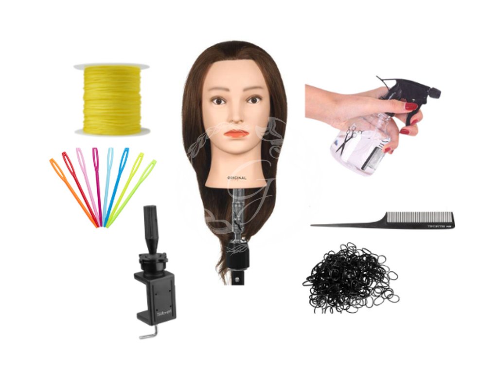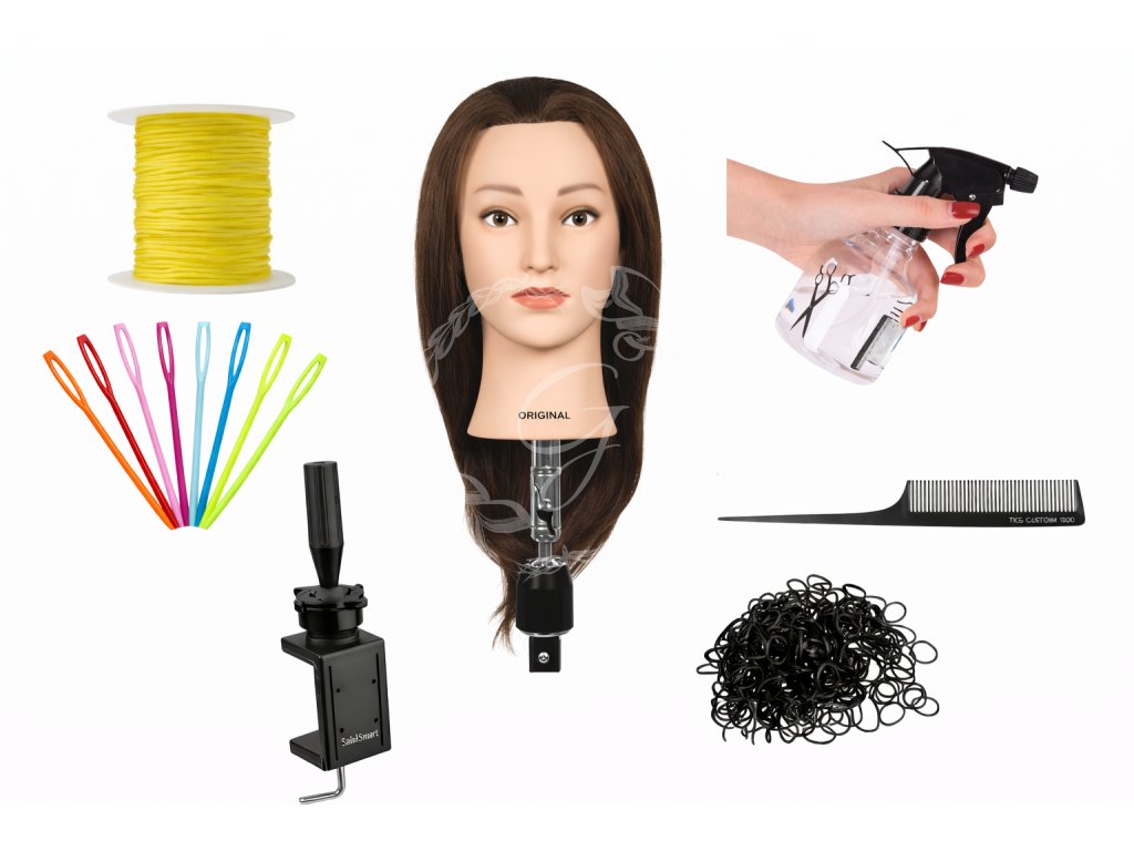 Součástí balíčku je cvičná hlava Elena se 100% lidskými vlasy a stojan, díky kterým můžete pohodlně a stabilně pracovat. Nechybí ani profesionální hřebínek Jaguar se špičkou pro precizní oddělování pramenů, rozprašovač na zvlhčení vlasů, kvalitní malé gumičky pro zakončování copánků, plastovou jehlu pro provlékání a praktickou šňůrku (barva vybrána náhodně).
