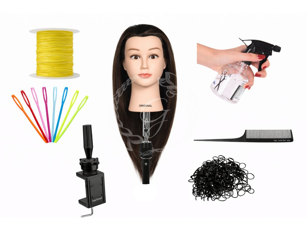 Součástí balíčku je cvičná hlava JESSY se syntetickými vlasy a stojan, díky kterým můžete pohodlně a stabilně pracovat. Nechybí ani profesionální hřebínek Jaguar se špičkou pro precizní oddělování pramenů, rozprašovač na zvlhčení vlasů, kvalitní malé gumičky pro zakončování copánků, plastovou jehlu pro provlékání a praktickou šňůrku (barva vybrána náhodně).
