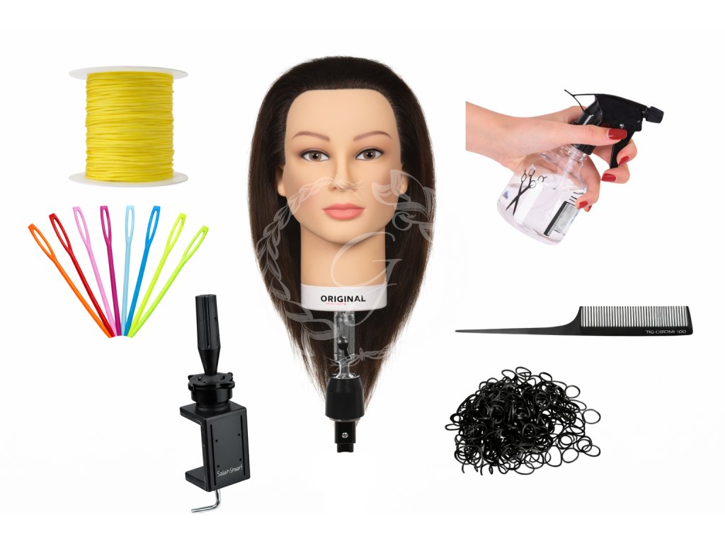 Součástí balíčku je cvičná hlava Valeska se 100% lidskými vlasy a stojan, díky kterým můžete pohodlně a stabilně pracovat. Nechybí ani profesionální hřebínek Jaguar se špičkou pro precizní oddělování pramenů, rozprašovač na zvlhčení vlasů, kvalitní malé gumičky pro zakončování copánků, plastovou jehlu pro provlékání a praktickou šňůrku (barva vybrána náhodně).