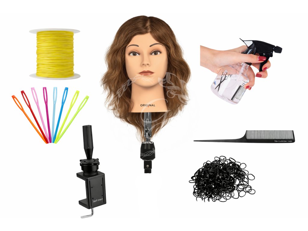 Součástí balíčku je cvičná hlava Jeanne se 100% lidskými vlasy a stojan, díky kterým můžete pohodlně a stabilně pracovat. Nechybí ani profesionální hřebínek Jaguar se špičkou pro precizní oddělování pramenů, rozprašovač na zvlhčení vlasů, kvalitní malé gumičky pro zakončování copánků, plastovou jehlu pro provlékání a praktickou šňůrku (barva vybrána náhodně).