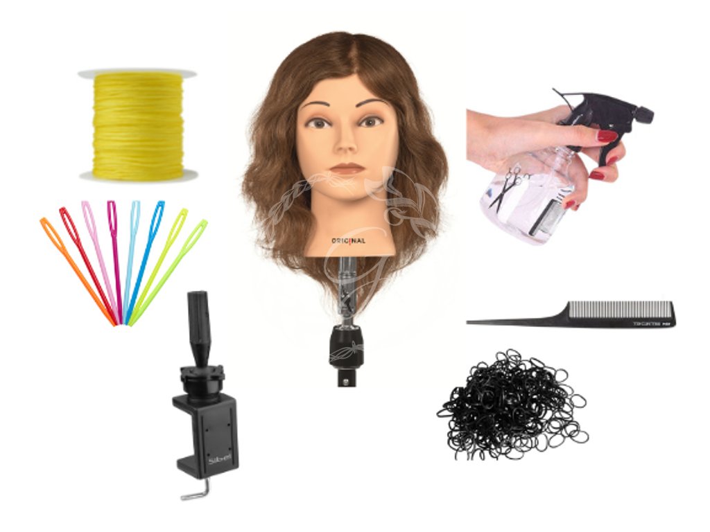 Součástí balíčku je cvičná hlava Jeanne se 100% lidskými vlasy a stojan, díky kterým můžete pohodlně a stabilně pracovat. Nechybí ani profesionální hřebínek Jaguar se špičkou pro precizní oddělování pramenů, rozprašovač na zvlhčení vlasů, kvalitní malé gumičky, plastová jehla pro provlékání a praktická šňůrka (barva vybrána náhodně).